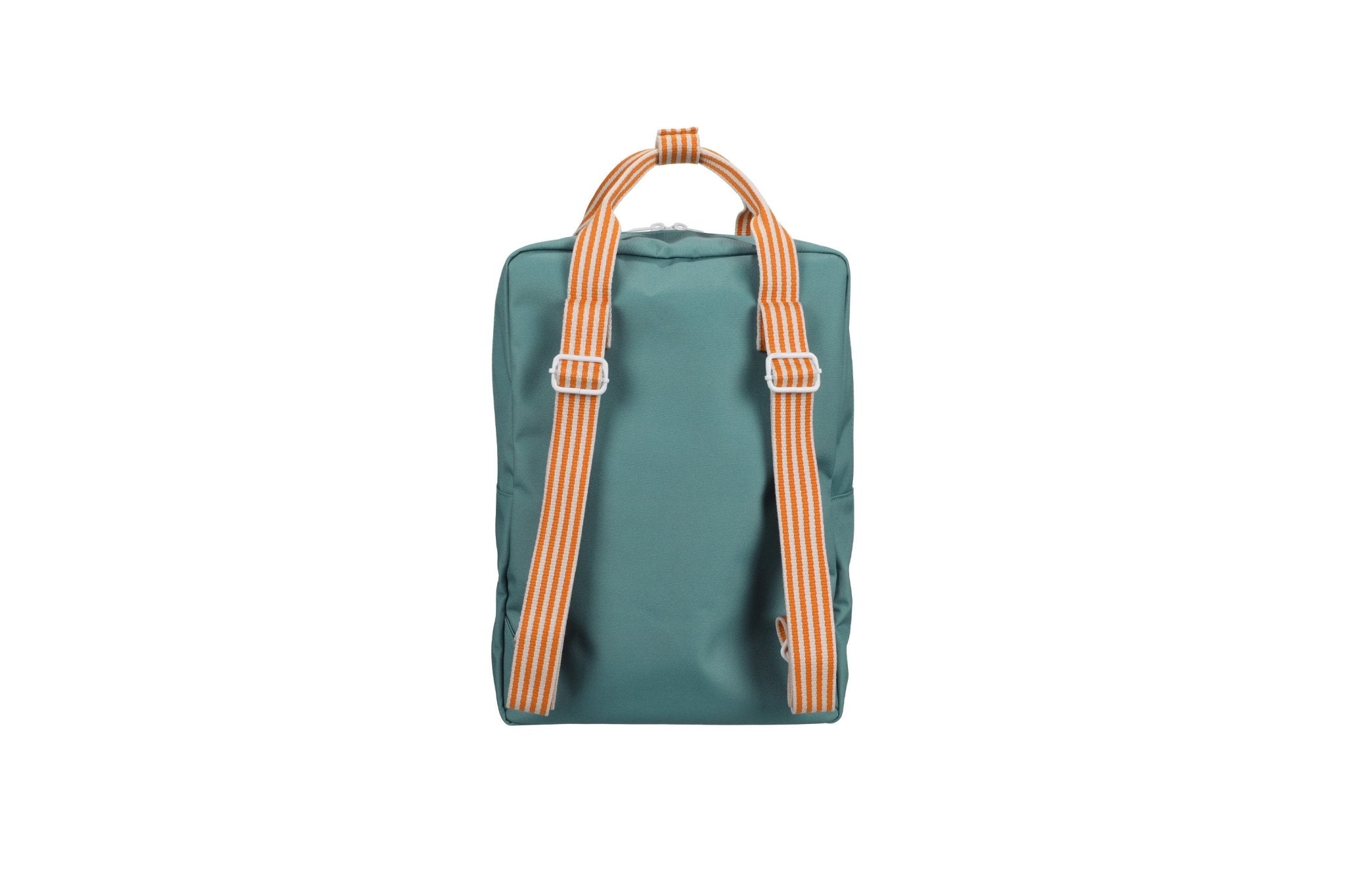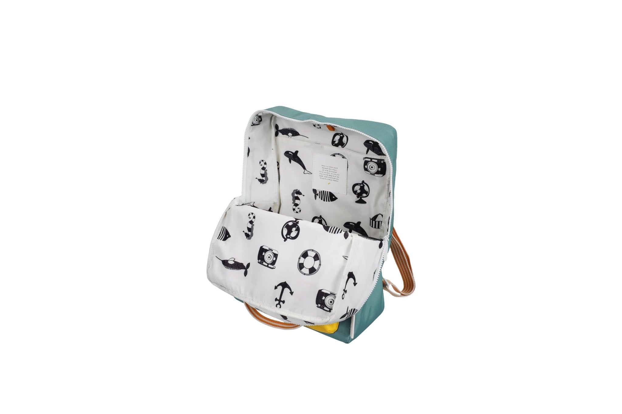 A mix of colors makes this bag stand out! It has an extra pocket on the front, waterproof lining with a handdrawn pattern and adjustable shoulder straps. On the inside you'll find an elastic band that serves as a bottle holder and a pocket all over the back that closes with velcro. There is also a name tag to put your info.