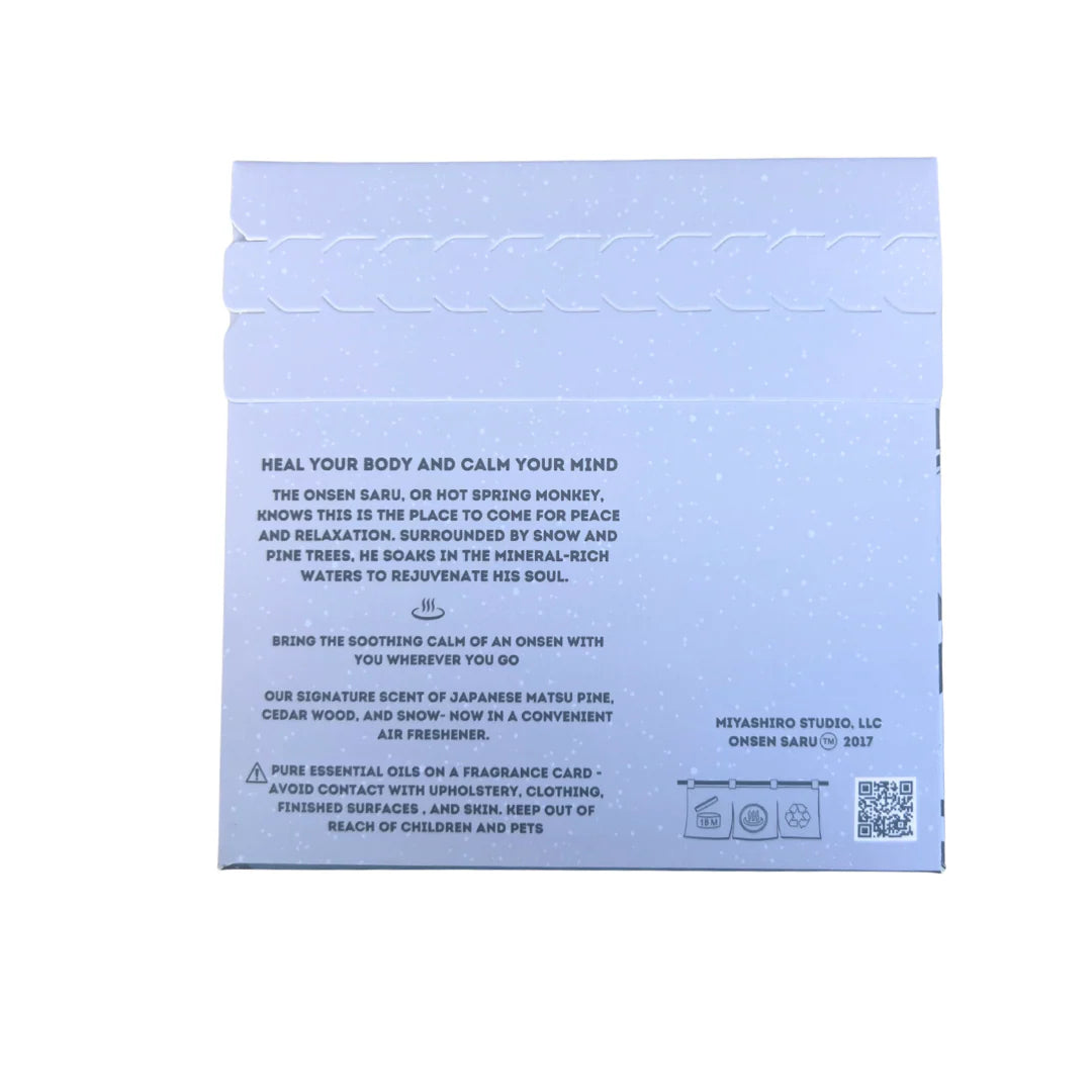 Bring the soothing calm of an onsen with you wherever you go.  Our signature scent of Japanese Matsu Pine, Cedar wood, and Snow, now in a convenient air freshener.