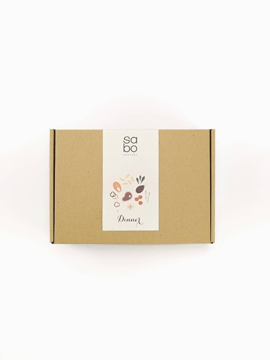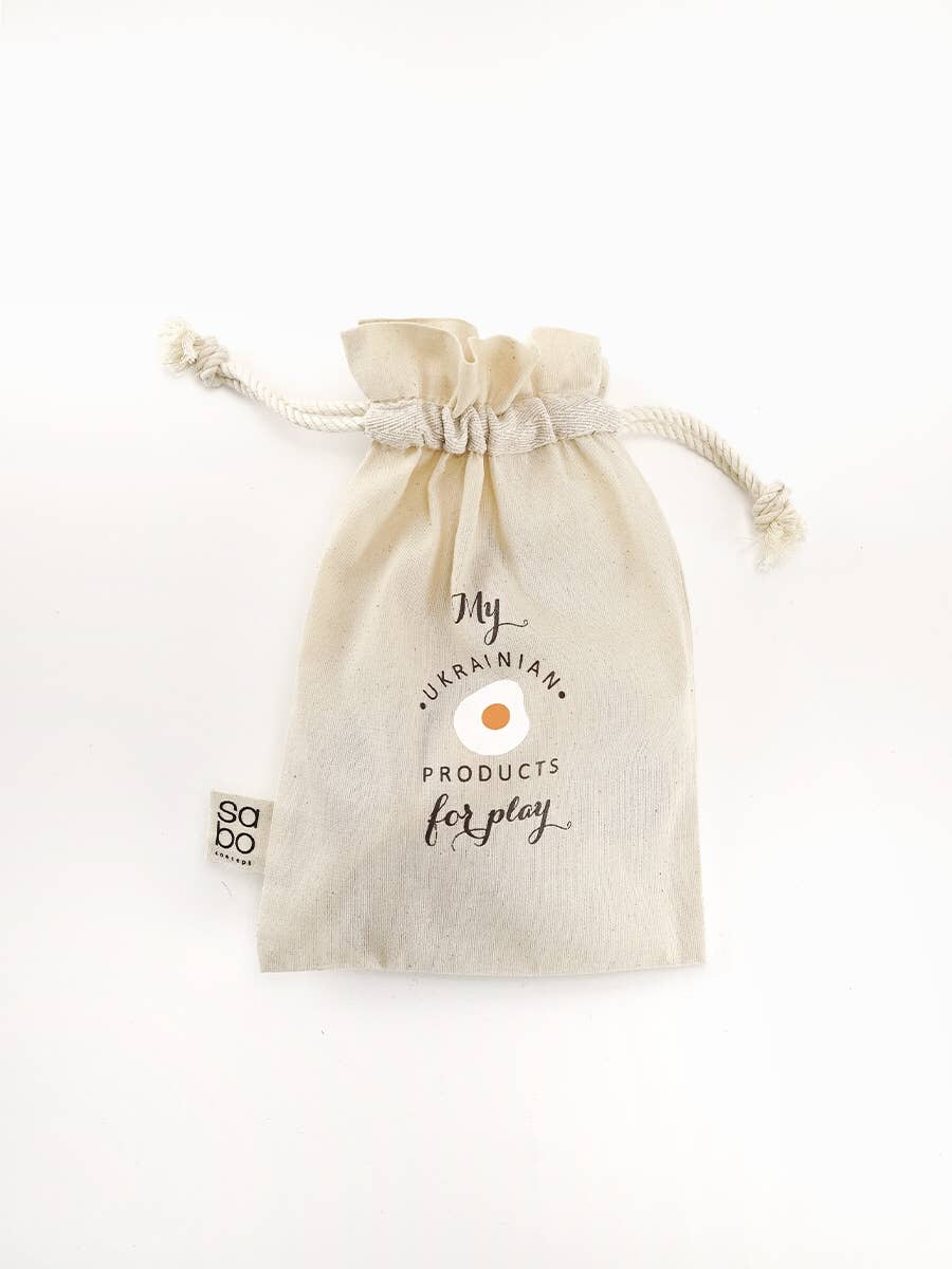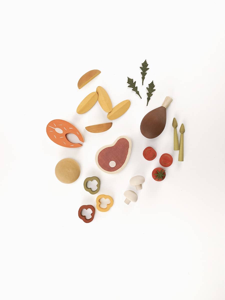 A detailed set of dinner dishes that you will fall in love with at first sight. You can put together a menu and play "the cafe", take and prepare orders, cook for parents or guests, or feed favorite toys. All parts are well sanded and pleasant to the touch. The set includes: - meat steak, salmon steak, chicken leg - 5 arugula leaves, 2 sticks of asparagus, 3 pepper rings, whole and two halves of cherry tomatoes, mushroom - bun - linen bag for storage