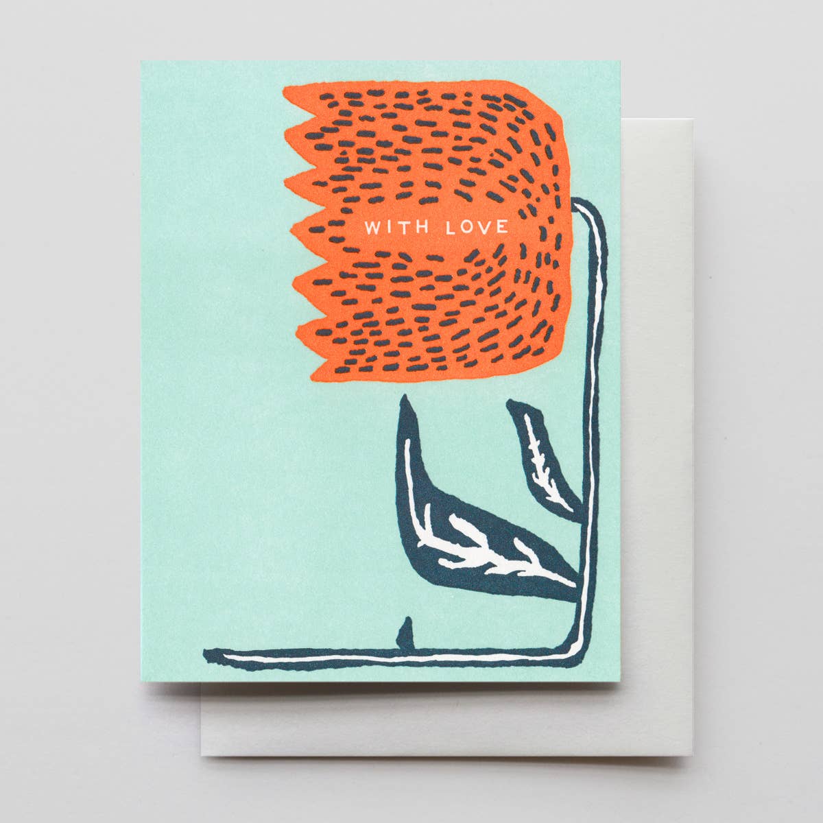 Folding note card with grout gray envelope. Letterpress printed on 110lb. Recycled white paper. Blank inside. Card size: 4.25" x 5.50" (folded). Packaged in plant-based polylactic acid (PLA) certified compostable bag.