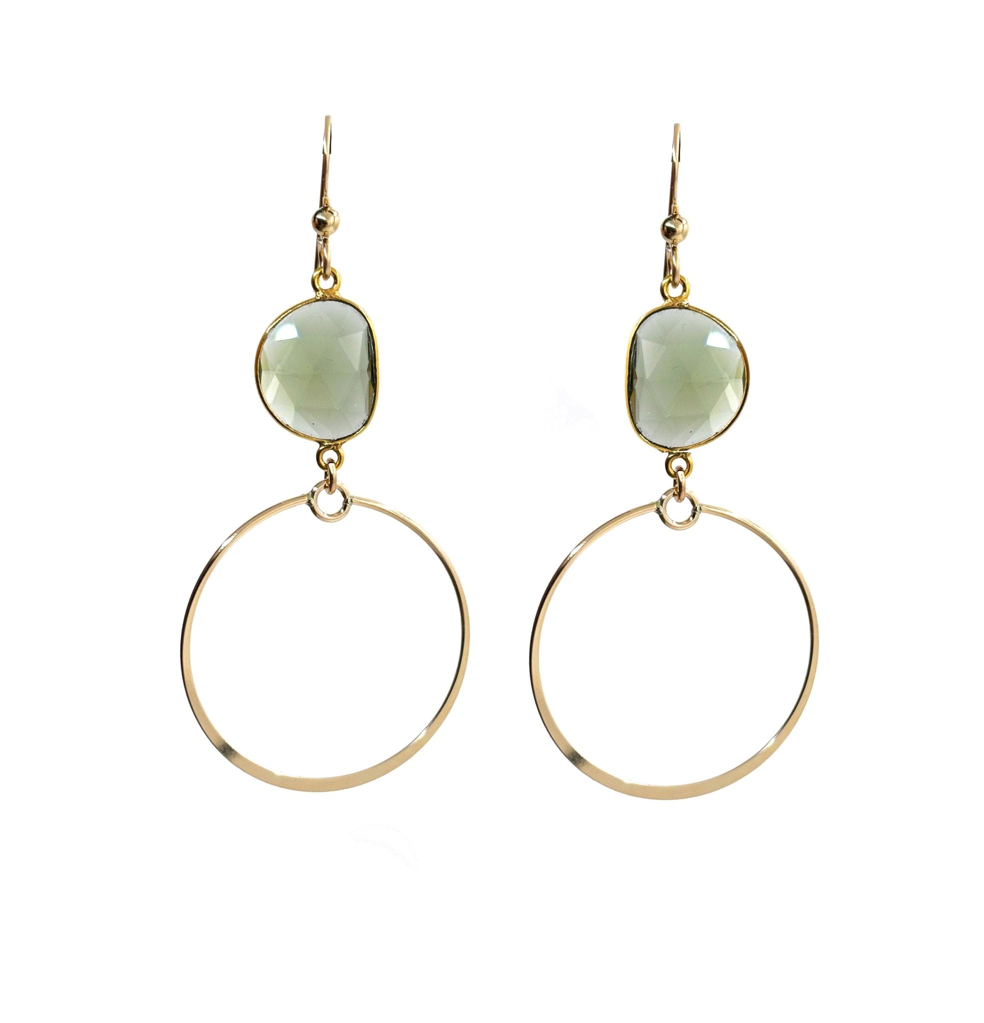 These 14k gold fllled dangle earrings feature faceted green amethyst stones. The earrings hang 2" long and 1" wide. They are lightweight and sparkle when they catch the light.