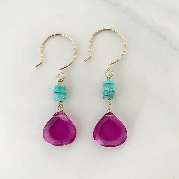 Fuscia glass drop and turquoise beads on gold-fill earwire; 1” long.